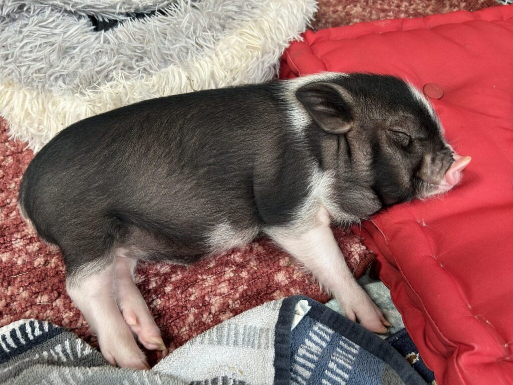 Winston came to us as a four-day-old orphaned piglet. His mother and three siblings passed away at or shortly after