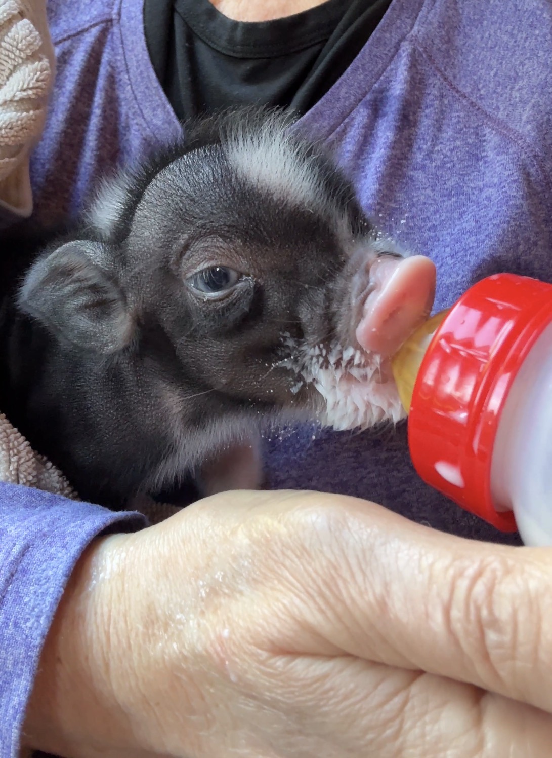 Winston came to us as a four-day-old orphaned piglet. His mother and three siblings passed away at or shortly after birth, leaving him as the sole survivor.